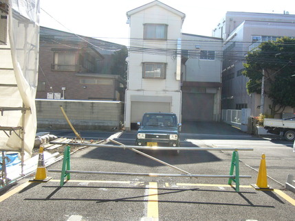 ただひとつだけ気になるのは、玄関が前面にある建物の玄関と対峙する場合、対立的な氣を生じる門冲煞という形煞ですが、下画像のように南側正面は、一階がガレージとなっているビルトインの建物で、玄関と対峙していることです。しかし道路を隔てて15m以上も離れており、対立の氣は散じるため、ほとんどこの煞気の影響はないと判断しました。(車は施主の自家用車で、歩道拡張工事現場に風水鑑定時だけ臨時で停車している。)