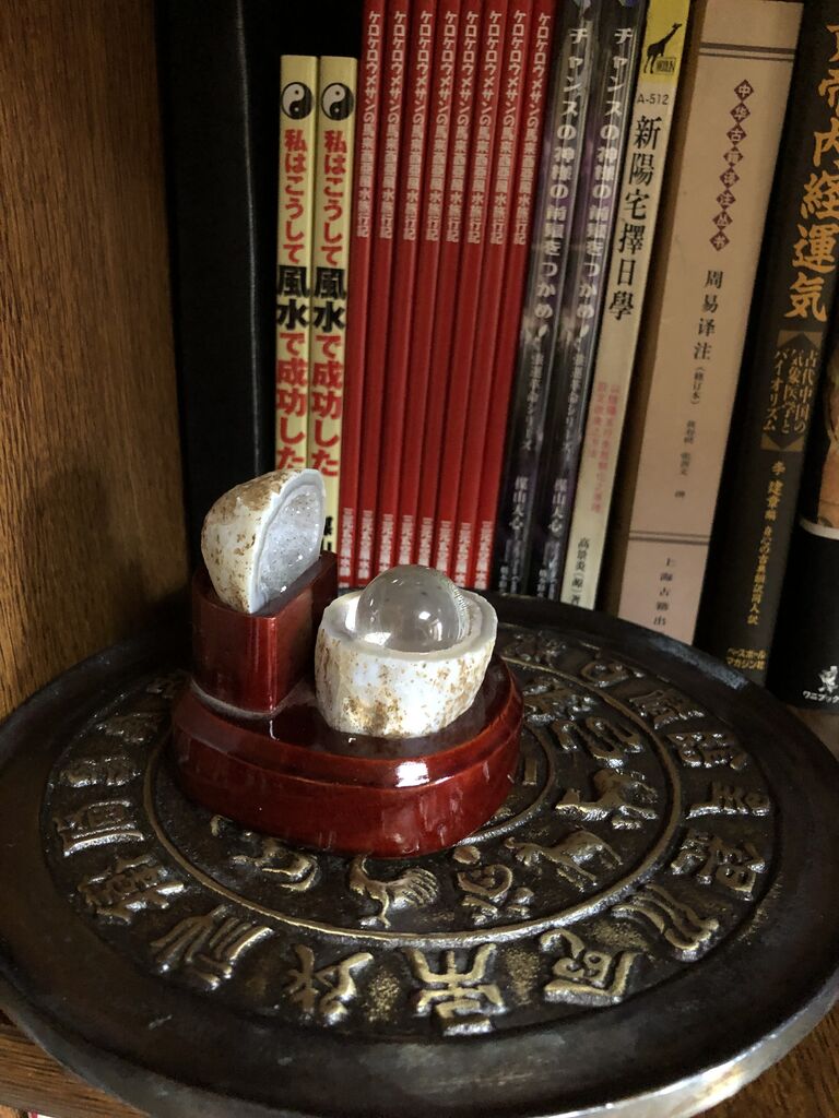 上記のように、家宅の中央付近に設置するか、家庭なら家長、会社なら社長の部屋に設置すると良いでしょう。下画像は、ウメサンちの一階太極部となる棚上に設置した『十二支八卦銅牌』で、銅牌上に聚寶盆、盆内に水晶玉を載せていますが、このように銅牌上に水晶玉や豼貅などを載せてもかまいませんし、皿立てで飾ってもかまいません。
