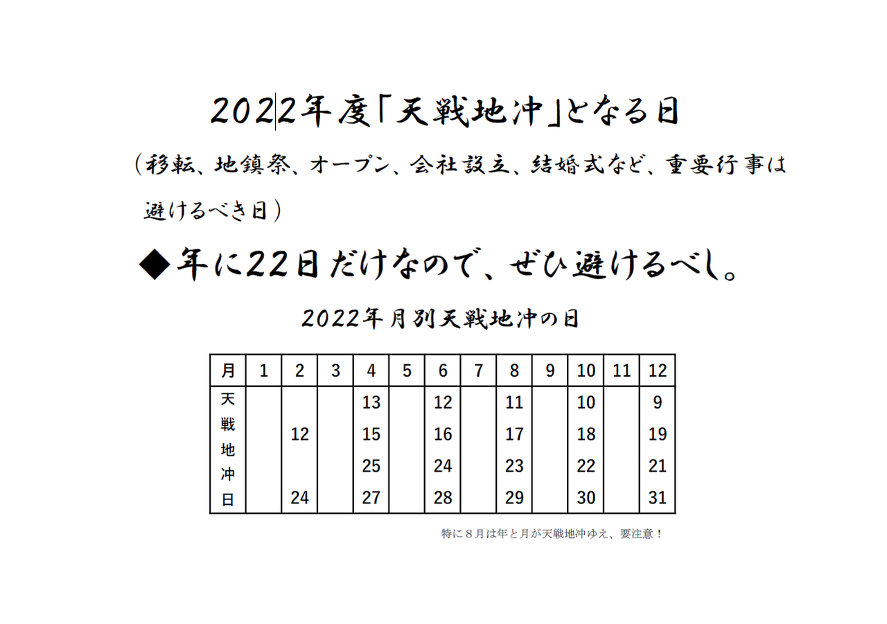 3月は引っ越しの多い月ですが、移転や開所、開店、結婚式などの重要行事は、天戦地冲となる年月日を避けることをお勧めします。