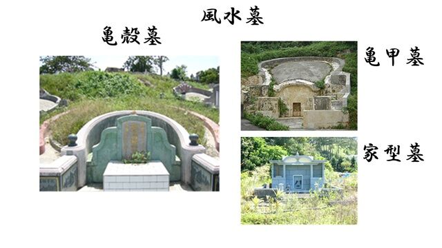 右上画像は、沖縄の伝統的な墓形態で亀甲のような形態ゆえ、亀甲墓という名称です。亀殻墓と似ていますが墓碑はない横穴式で、亀甲のような部位の内部に土葬されています。墓形態からわかるように、沖縄には琉球王朝時代に、中国より風水思想が伝来していたのです。