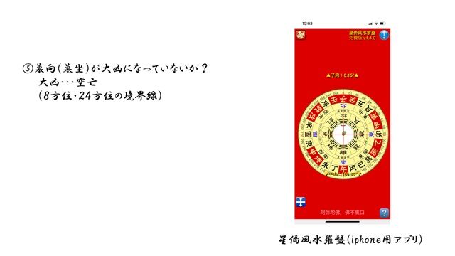 ぜひ自分の家系におけるお墓の向きは知っておくべきです。その為には、実物の羅盤を用いるのがベストですが、画像にあるようなスマホ版風水羅盤アプリでも、空亡か否かは確認できます。この画像にあるアプリは、台湾のNCCという中国五術の書物や羅盤はじめ卜占用具を販売している著名な会社が作成し、無料配布している「星僑風水羅盤」です。
