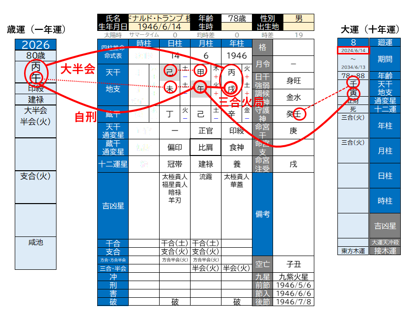トランプ大統領は比肩建禄格ですが、一本気の性格で人の意見に左右されないゴーイングマイウェイな方ですが、丙午年の今年は、それが強力に助長され過ぎて、強い自己顕示欲となって、言動に表れていると感じます。もともと比肩建禄は生月支の午より生じているのですが、この午は生年支「戌」と半会、生日支「未」と支合で強められ、強力な比肩建禄です。さらに2024年から2034年までは大運支「寅」が加わり、寅-午-戌の三合火局が形成されて、超強力になっています。