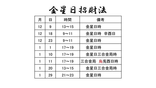 1月丑月は、酉刻(17時~19時)を使うと、巳-酉-丑の三合金局が形成されますので、金星日の酉刻もお勧めです。